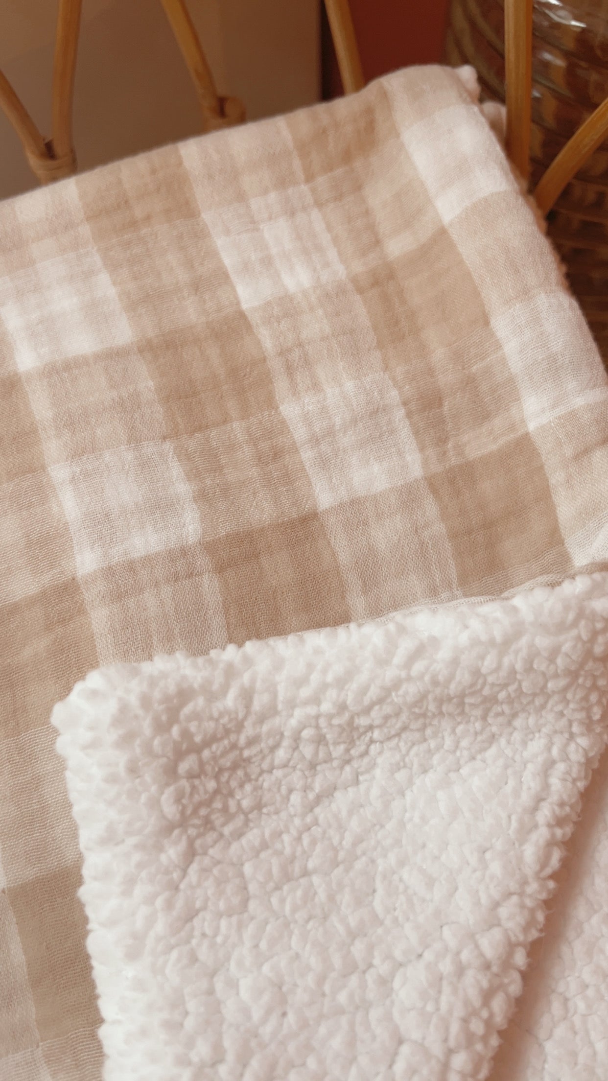 Couverture Vichy beige et sherpa blanche ou ivoire, coton BIO fleuri, personnalisée, bébé, hiver ou été, taille 70x100cm, douce et chaude