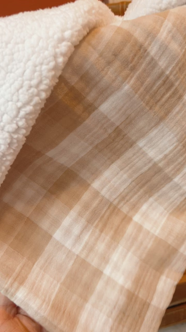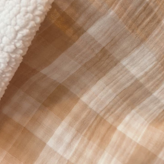 Elle se compose d’une fausse fourrure Sherpa ultra douce, parfaite pour garder votre bébé bien au chaud lors des saisons froides, ou en version été, sans ouate pour une légèreté optimale. La face en coton BIO Vichy apporte une touche naturelle et élégante, idéale pour une ambiance chaleureuse dans la chambre de bébé.
