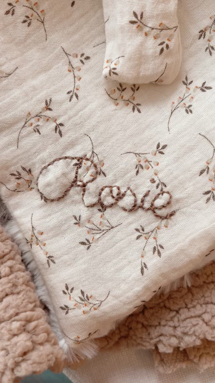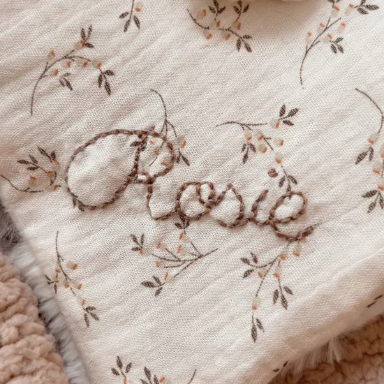 La broderie est réalisée à la main avec le plus grand soin sur le bas de la couverture. La couleur du fil sera assortie au tissu choisi, cependant, certains tissus à l'imprimé très présent nécessairement une broderie au fil noir.