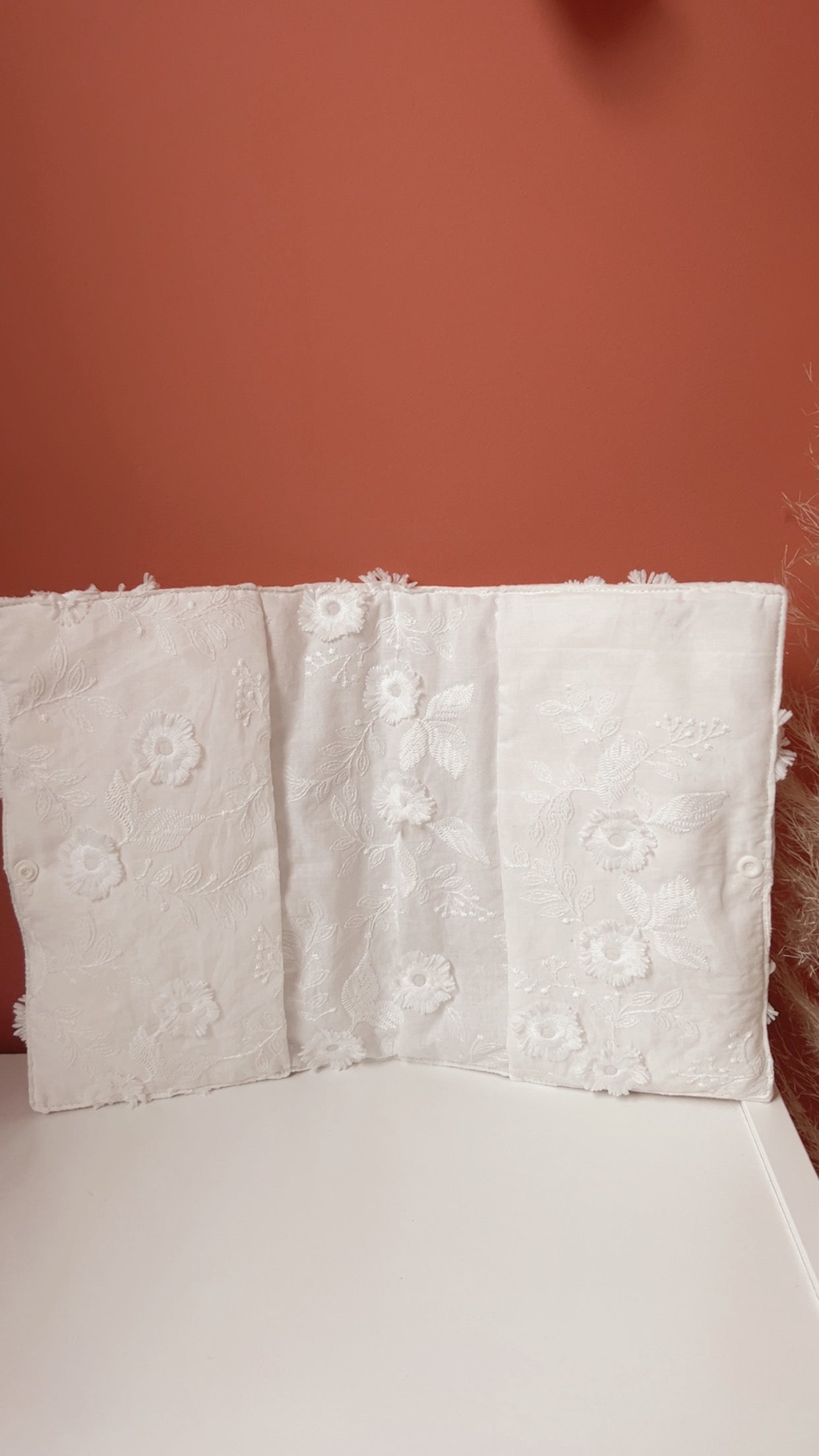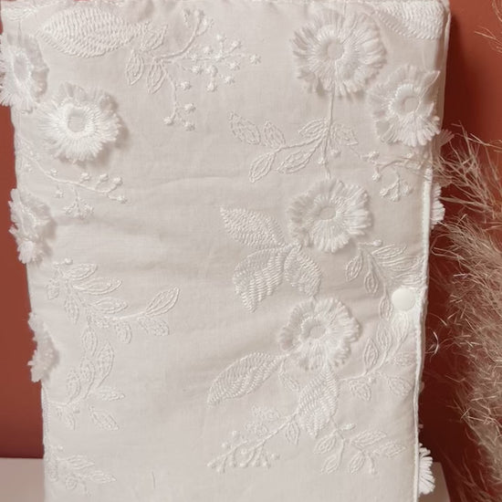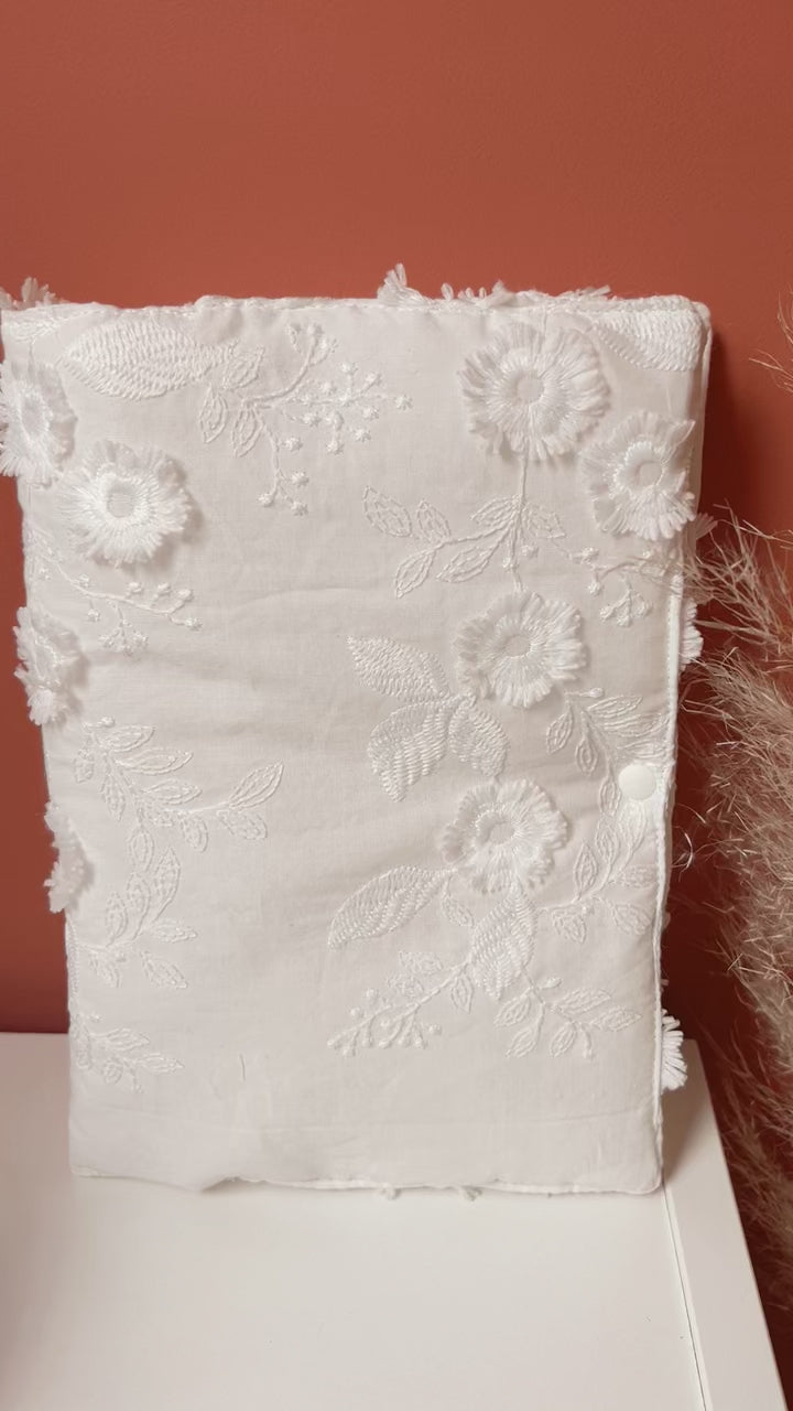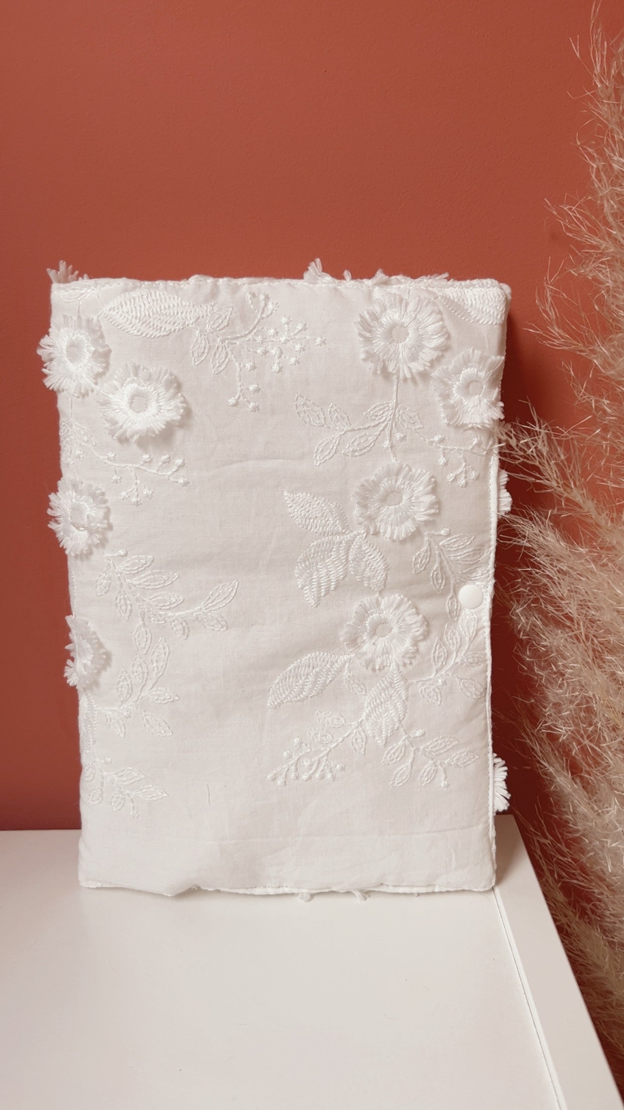 Protège carnet fabriqué à partir d'un tissu en voile de coton blanc cassé avec de jolies fleurs en reliefs.