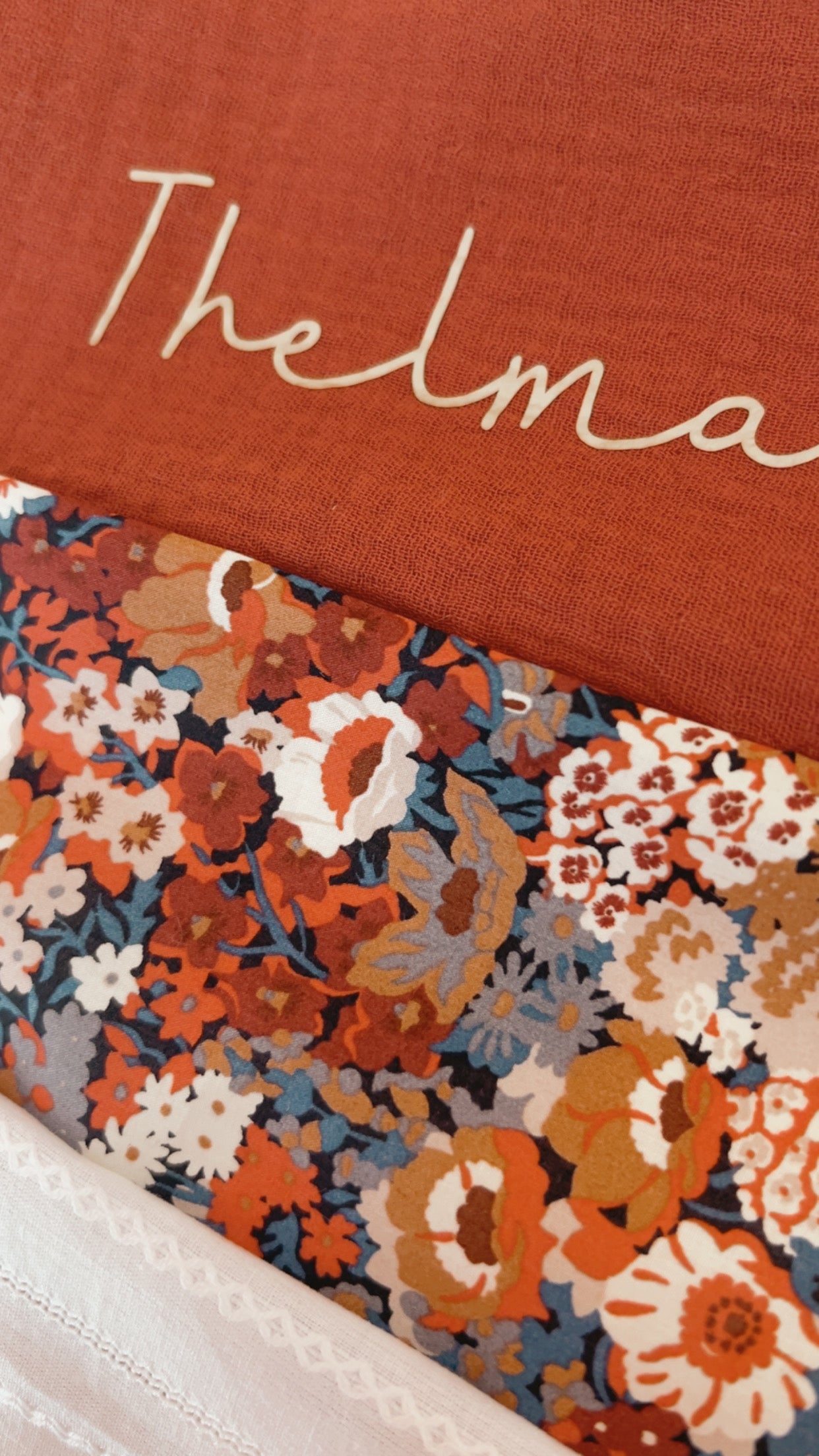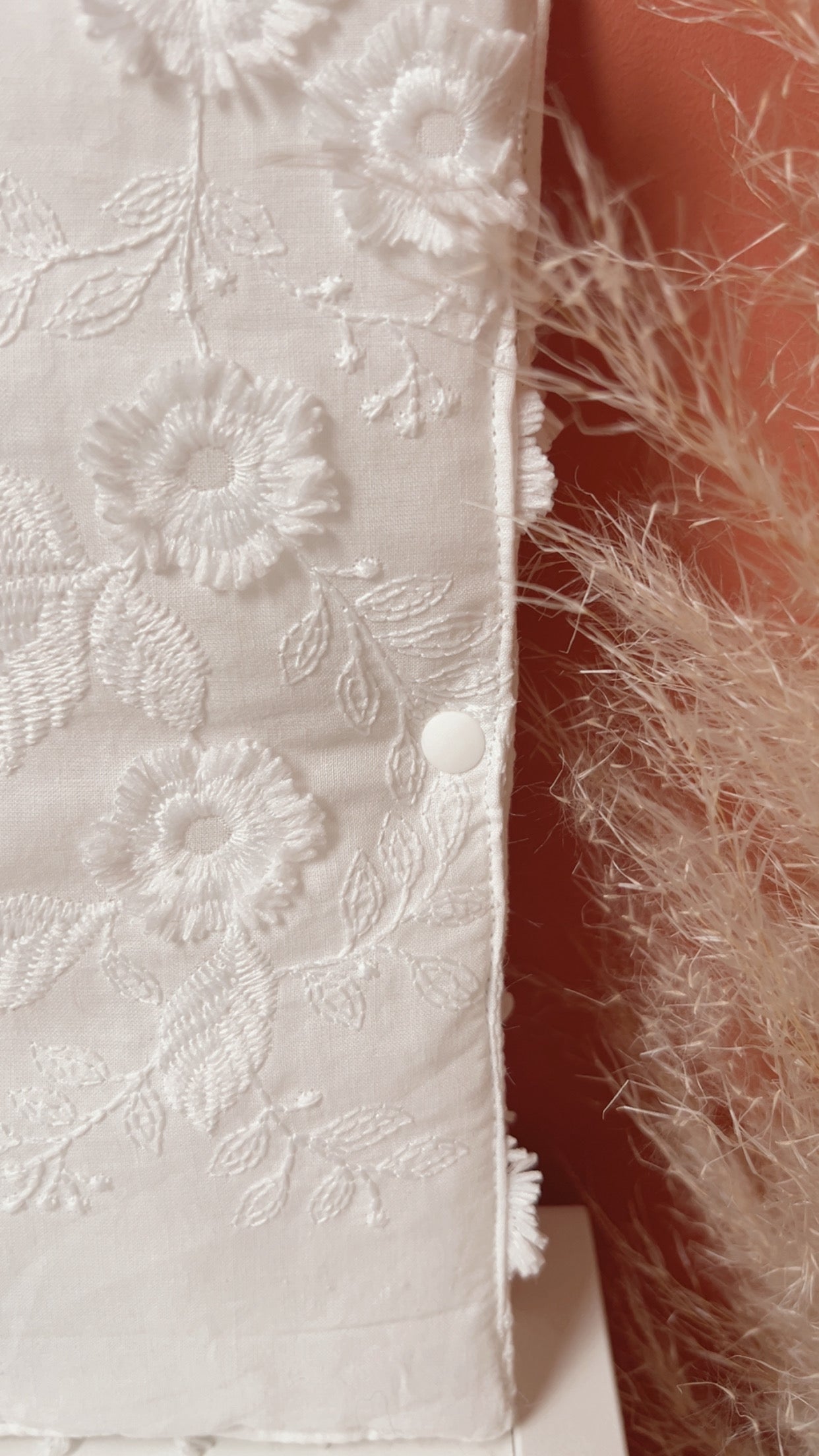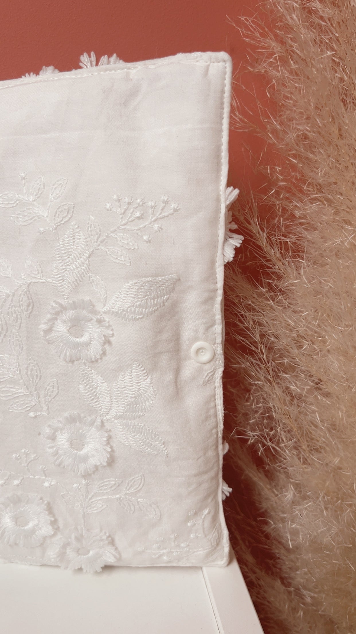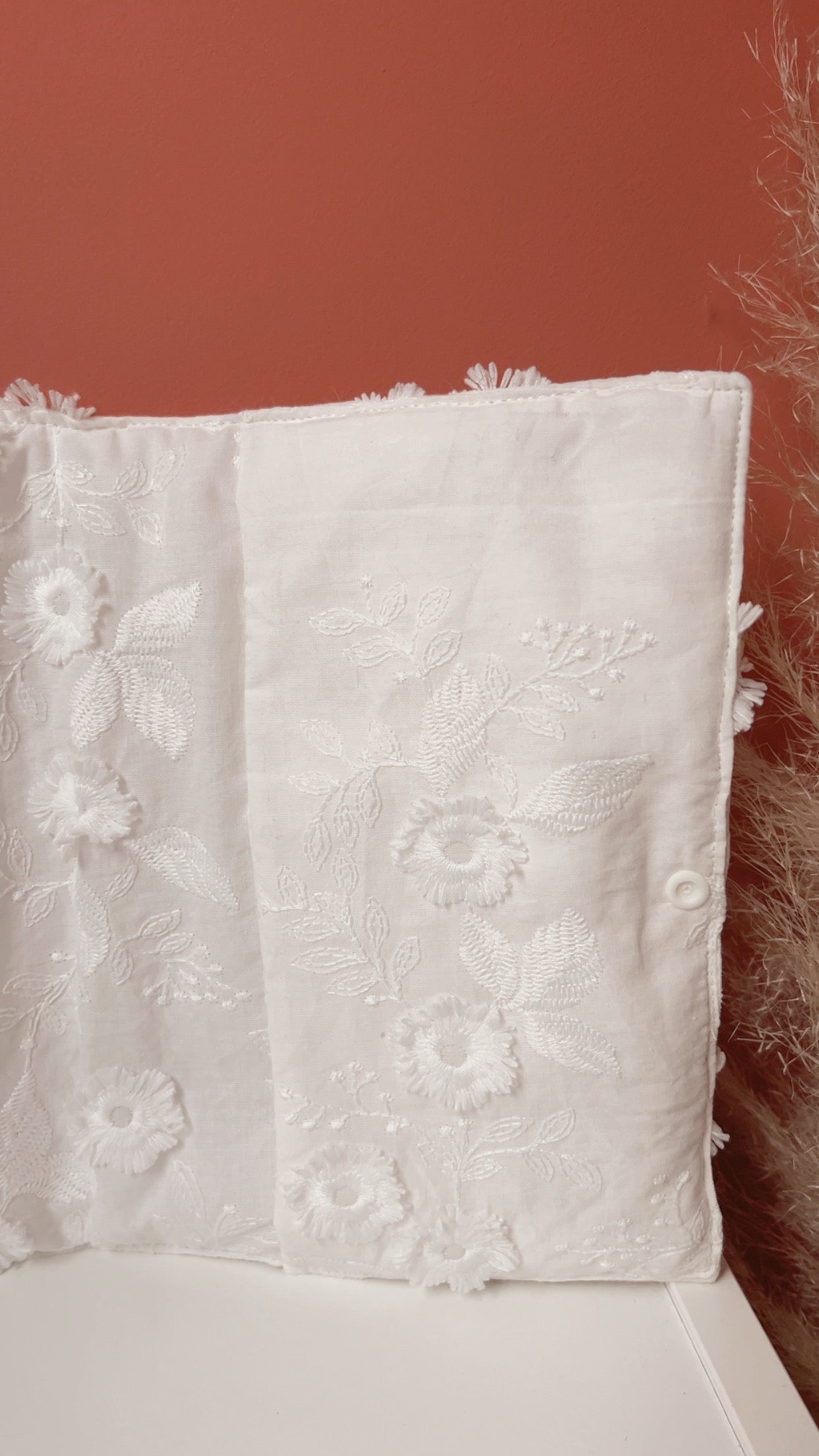 Protège carnet fabriqué à partir d'un tissu en voile de coton blanc cassé avec de jolies fleurs en reliefs.